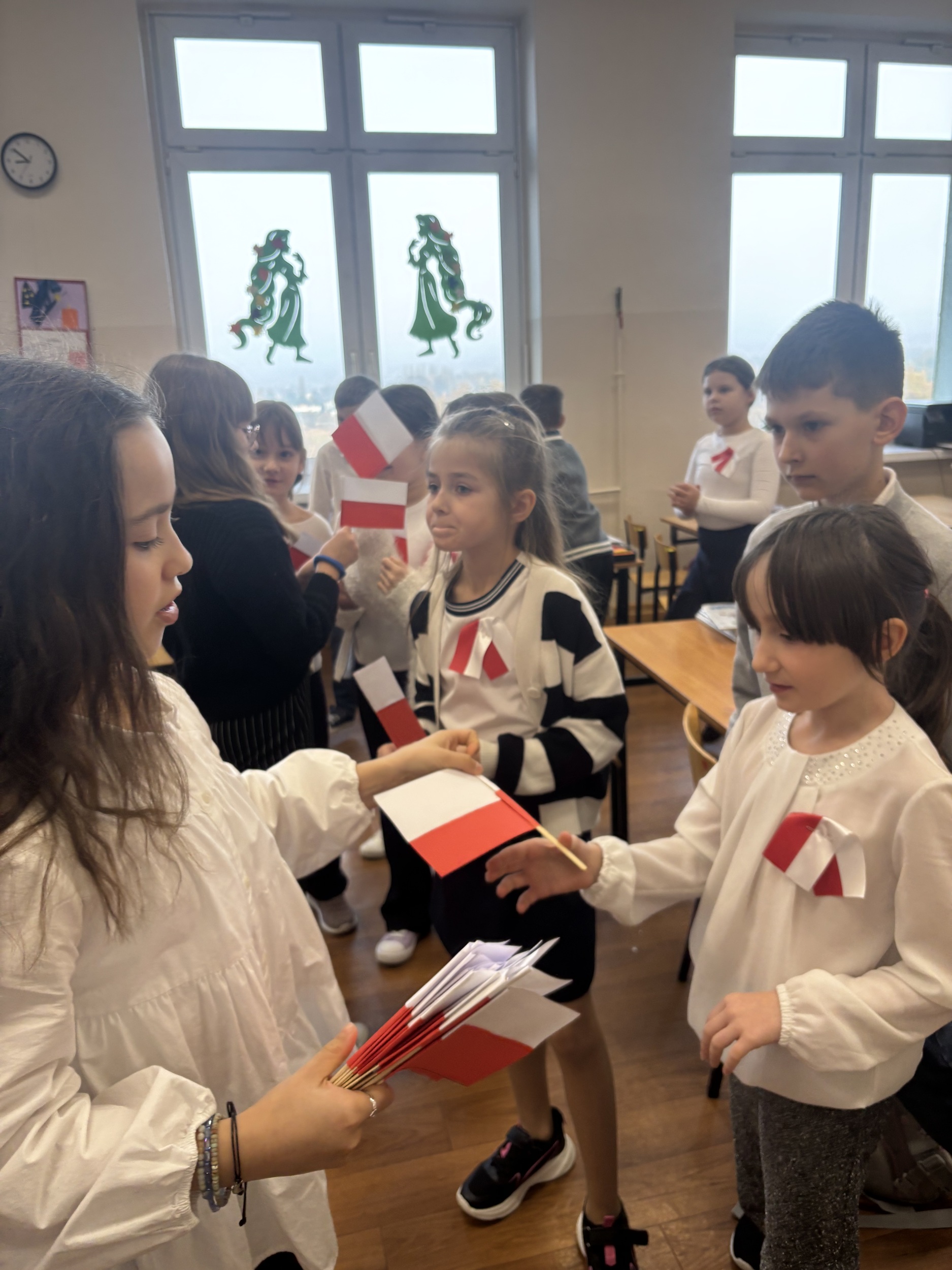 Dla uczczenia 107. rocznicy odzyskania niepodległości przez Polskę i podkreślenia patriotycznego charakteru święta Samorząd Uczniowski zorganizował akcję „ Biało- czerwona dla każdego”. Starsi uczniowie wręczali młodszym kolegom i nauczycielom własnoręcznie przygotowane flagi, z którymi wszyscy udali się na apel. To była mała lekcja patriotyzmu i koleżeństwa.