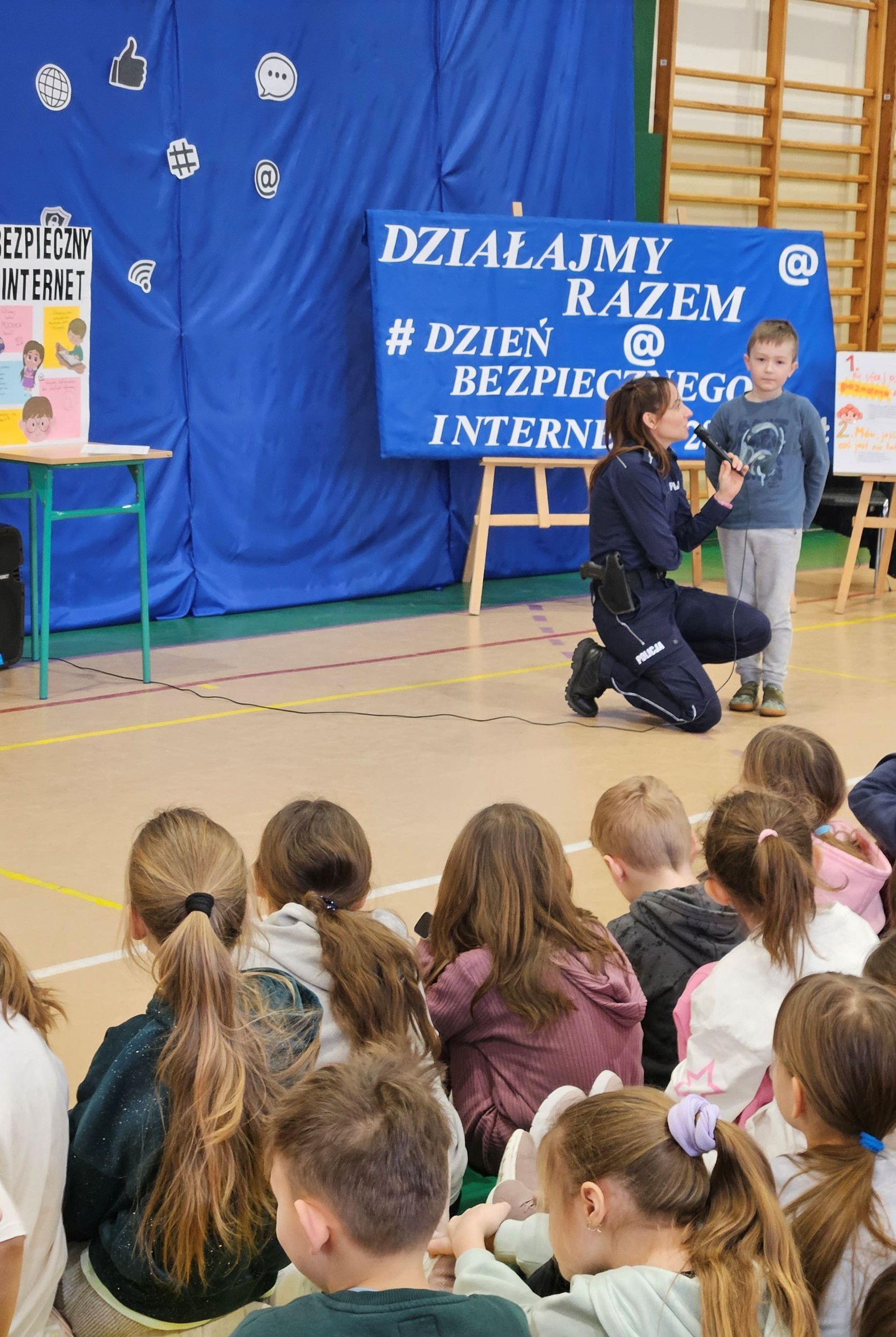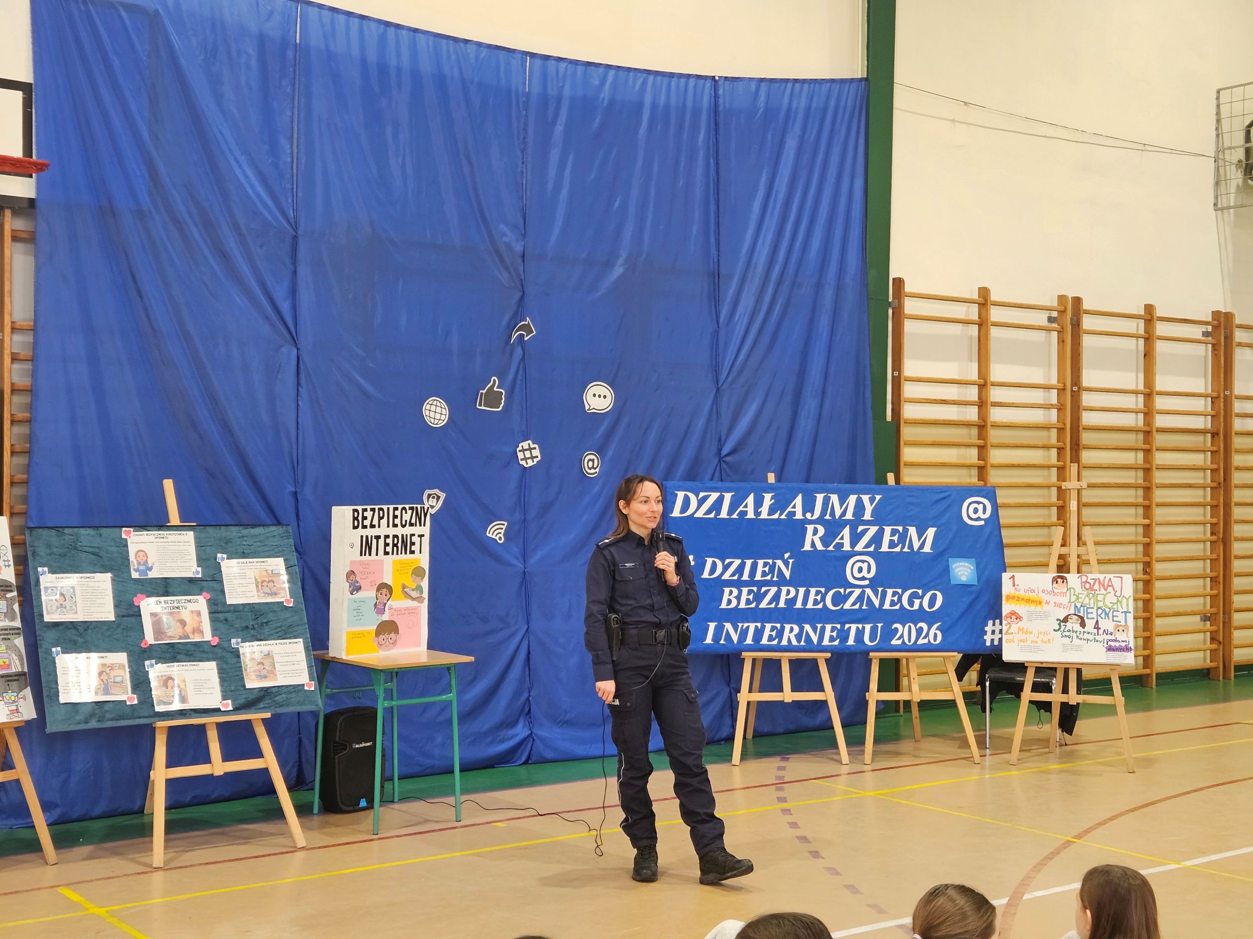 Spotkanie odbyło się w dwóch grupach: grupa przedszkolna "0" i klasy I- IV oraz klasy V- VIII. Pani aspirant przybliżyła młodszym uczniom tematykę zagrożeń w sieci oraz sposobów radzenia sobie z cyberprzemocą. Uczniowie otrzymali opaski do samodzielnego wykonania mające na celu wzmocnienie przekazu i utrwalenie poruszanych treści. Starsi mieli okazję wysłuchać prelekcji dotyczącej przestępstw w internecie, hejtu oraz odpowiedzialności za czyny karalne popełniane w sieci.