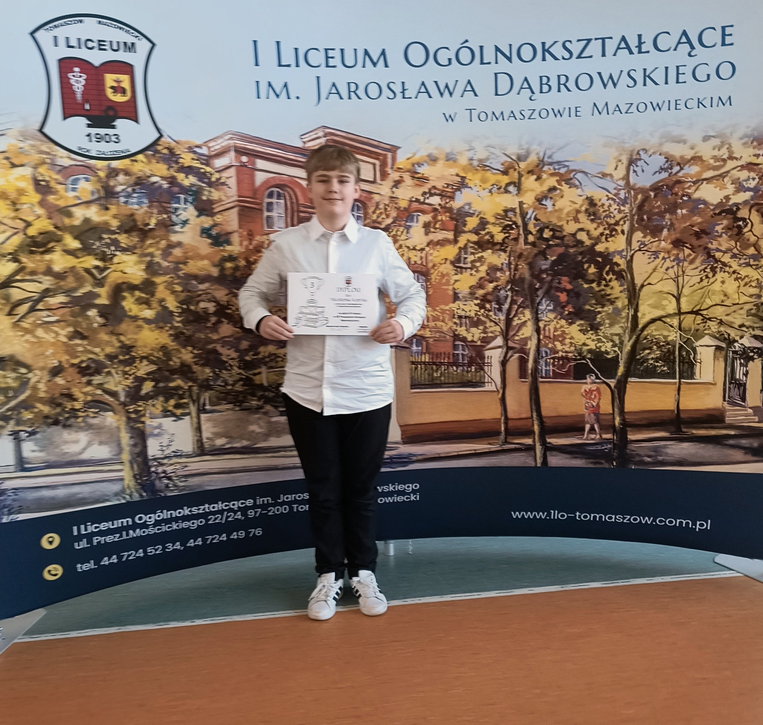 17 kwietnia w I LO w Tomaszowie Maz. w czasie uroczystości podsumowania konkursów powiatowych adresowanych do uczniów szkół podstawowych, uczeń klasy VIIIa Nikodem Koprek odebrał dyplom za zajęcie III miejsca w Powiatowym Konkursie Matematycznym.