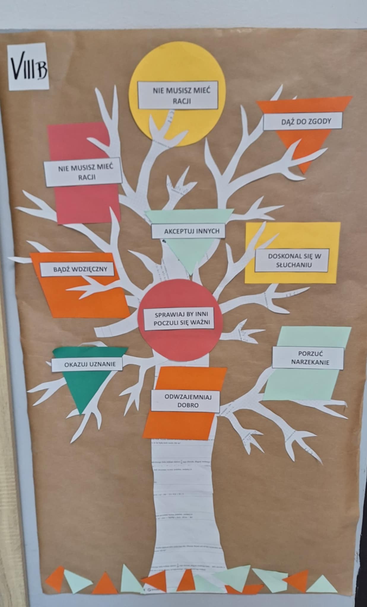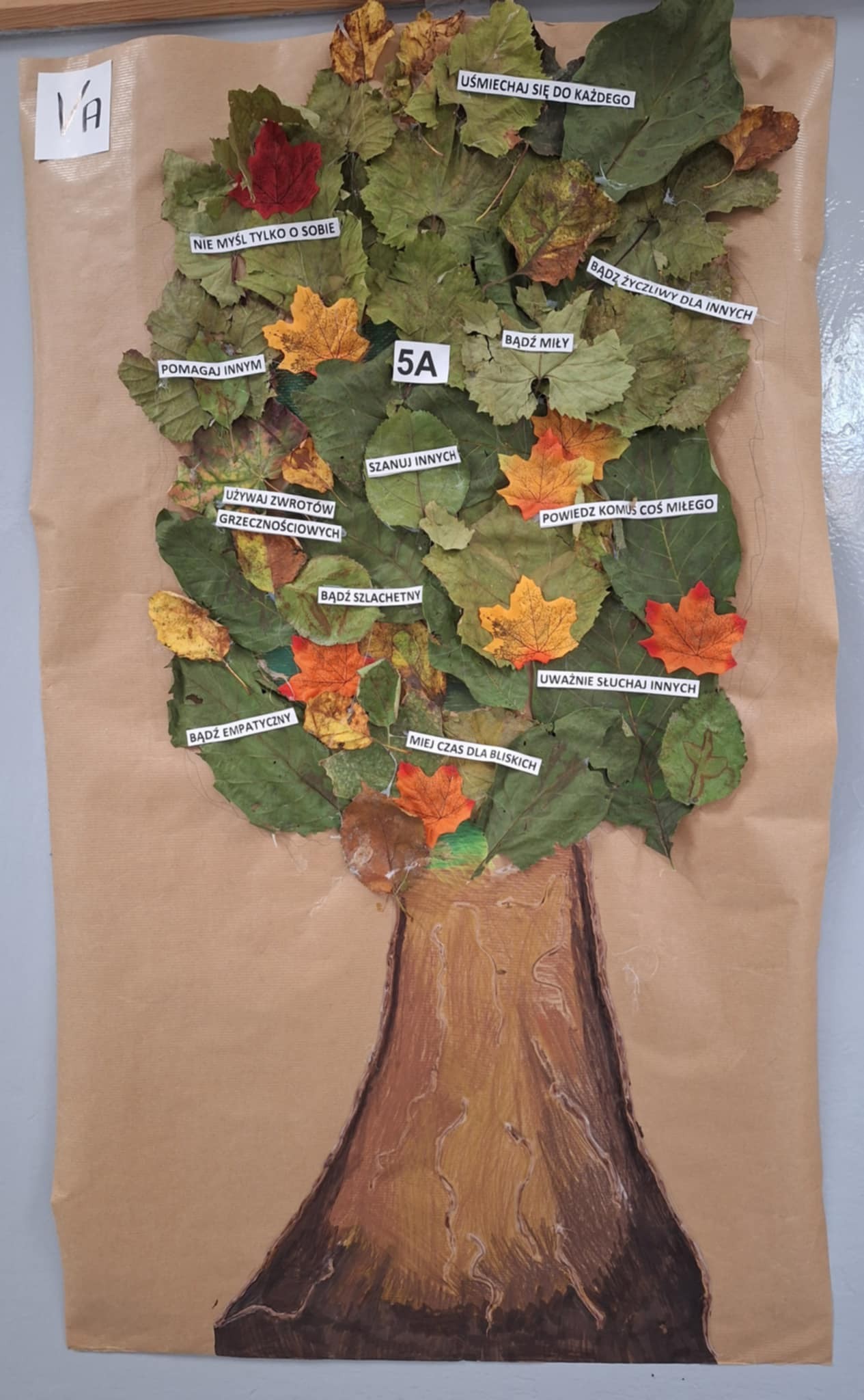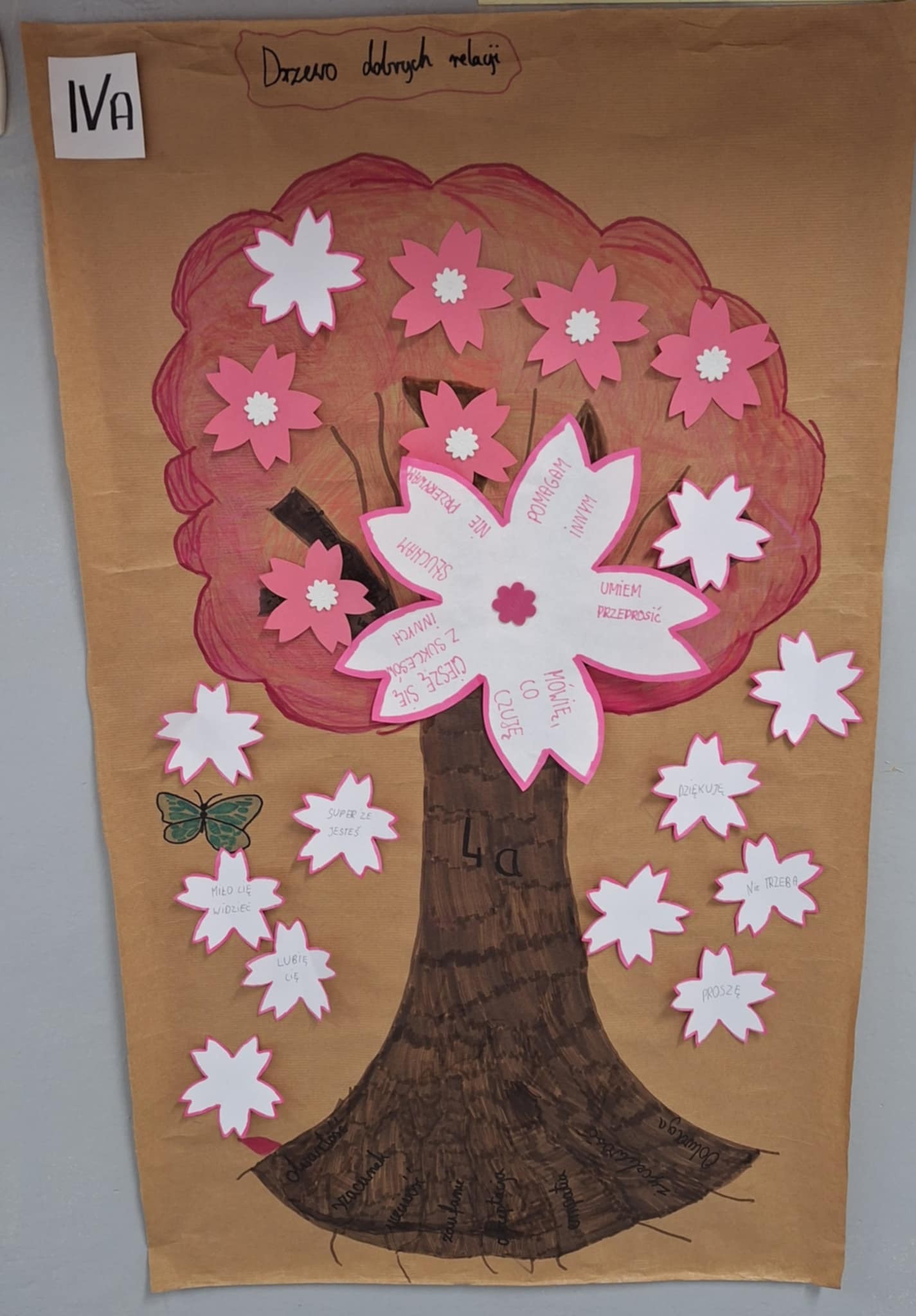 We wtorek parter szkoły przyozdobiły piękne prace plastyczne „ Drzewa dobrych relacji”, przygotowane przez poszczególne klasy. Na ozdobach drzew- kwiatach, owocach, liściach, uczniowie zapisali zasady dobrych relacji, zasady właściwego zachowania wobec innych ludzi.
