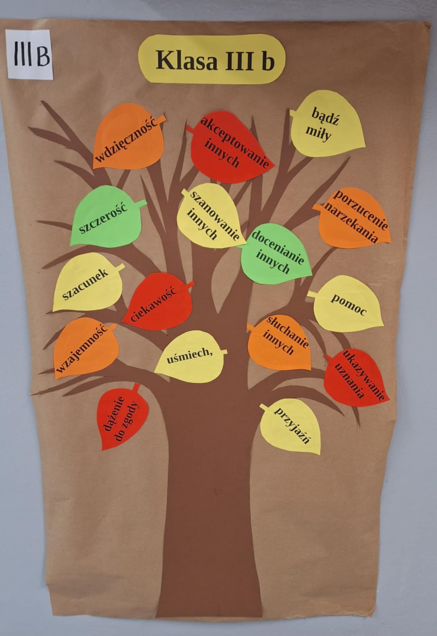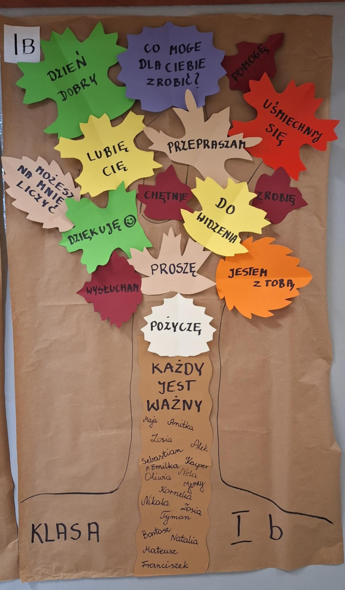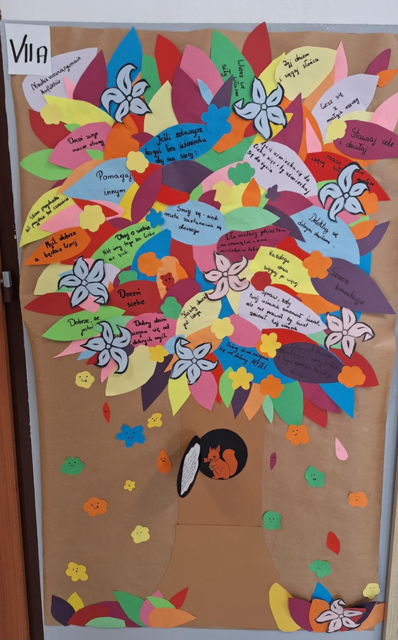 We wtorek parter szkoły przyozdobiły piękne prace plastyczne „ Drzewa dobrych relacji”, przygotowane przez poszczególne klasy. Na ozdobach drzew- kwiatach, owocach, liściach, uczniowie zapisali zasady dobrych relacji, zasady właściwego zachowania wobec innych ludzi.