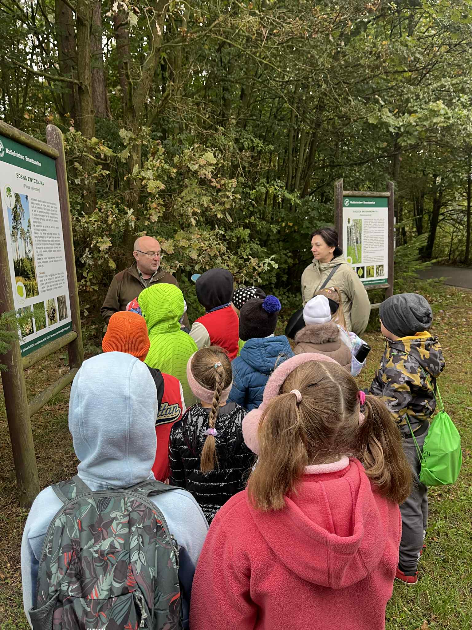 Naszą wycieczkę rozpoczęliśmy od przejścia ścieżką przyrodniczą, gdzie uczniowie mieli okazję zapoznać się z różnorodnością gatunków drzew i roślin występujących w polskich lasach.